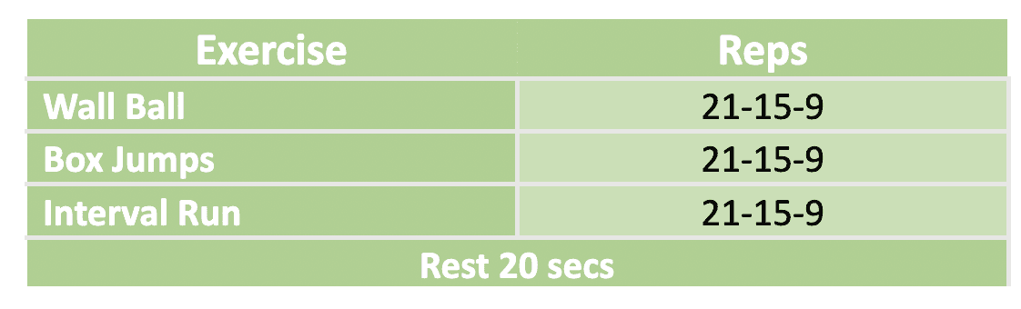 21-15-9 Definition: This is the rep structure you’ll follow. Perform 21 reps of each move in the first round, 15 in the second and nine to finish.