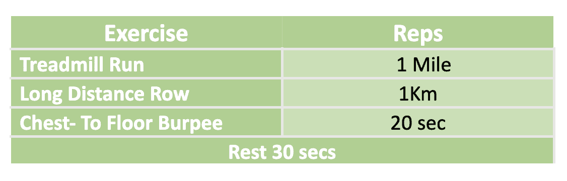 Work rest Ratio: The time it takes to complete a round dictates how long you rest. In this case, your rest is equal to your work times.