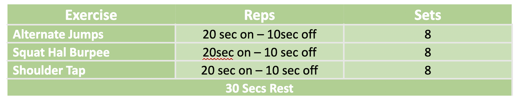 Tabata: The toughest 4 min workout you’ll ever do. Follow 20 secs of maximum effort with 10 secs of rest. Repeat 8 times.
