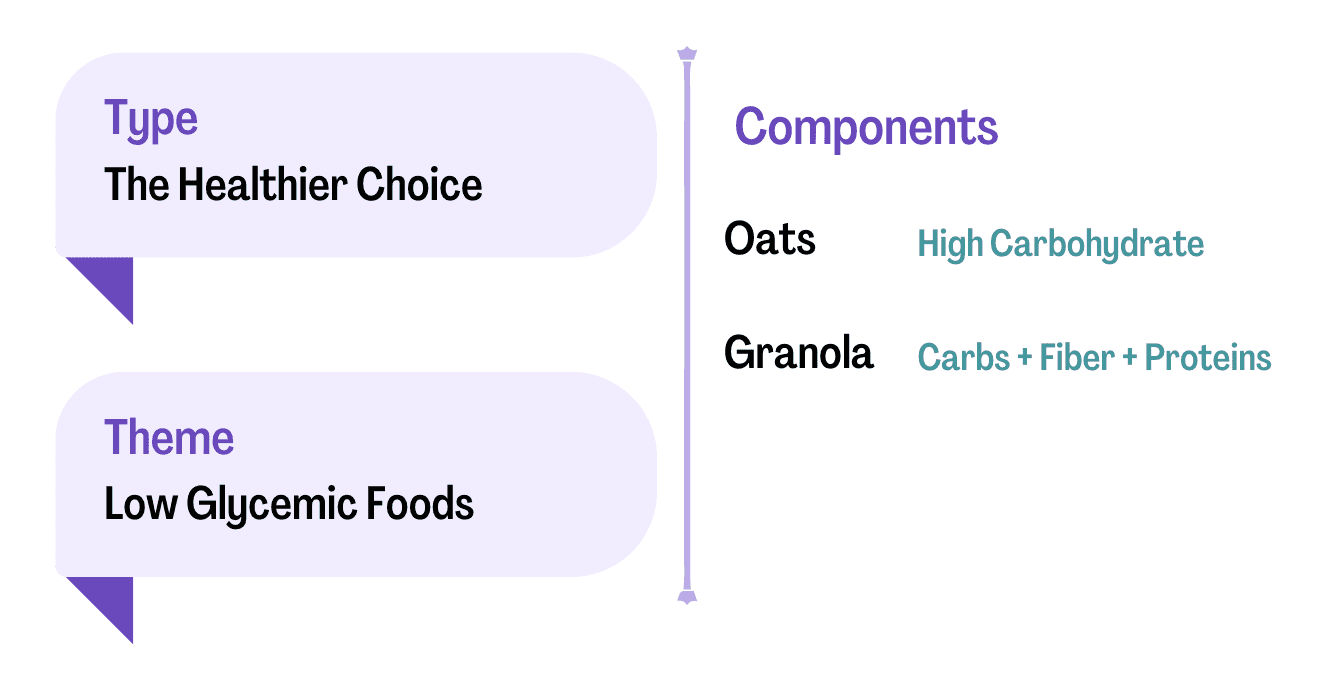 Granola has much less carbohydrates than Oats. have more carbohydrates than granola, and hence the spike in glucose levels will be less with granola. Granola also contains Nuts and Healthy Fats, which slow down the release of glucose in blood, and consequently a lower glucose spike.