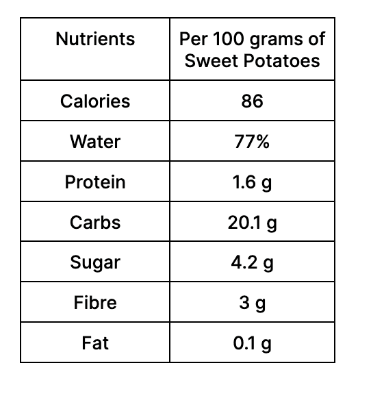 Sweet potatoes have high fibre content as compared to normal potatoes which leads to a lower GI and hence, a less immediate effect on sugar levels. The GI of sweet potato is 70 and that of white potatoes is around 82.