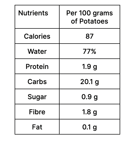 Potatoes are primarily composed of carbohydrates in the form of starch. The contents of the carb range between 60-80% according to their size. They are a good source of many vitamins as well as minerals such as vitamin C and potassium. They are also high in content water when they are fresh. It contains minimal or no fat and moderate amounts of fibre and protein. Simpler forms of sugars such as fructose, glucose, and sucrose are also present. It contains a friendly starch which is good for digestive health and the gut. It also contains some antioxidants.