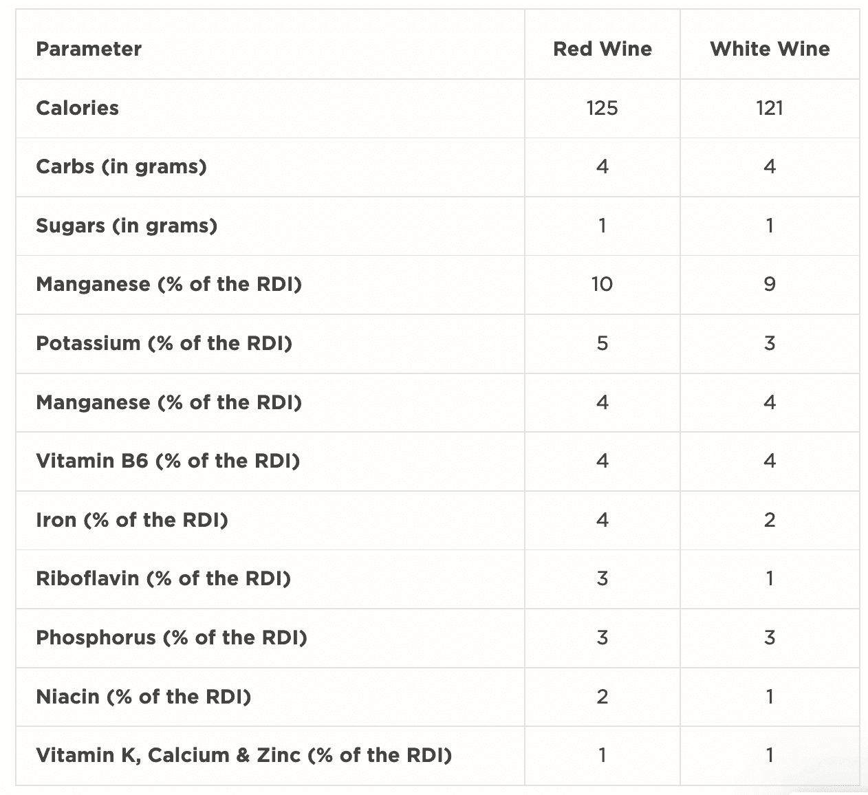 Nutrient Profile of Red Wine and White Wine per 5 Ounce (148 ml)